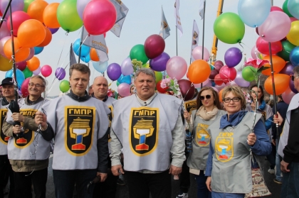 В числе демонстрантов представители Горно-металлургического профсоюза России во главе с председателем Алексеем Безымянных. По традиции колонну ГМПР отличает единая форма. В нее охотно облачились и члены семей, дети. Над нашей колонной развиваются флаги профсоюза, разноцветные цветы и шары.