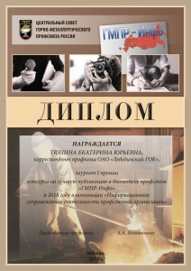1 премия – Тюпиной Екатерине Юрьевне, корреспонденту профкома АО «Лебединский ГОК»;