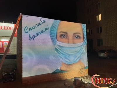 На стене насосной станции, после ее очистки волонтерами, новотроицкая художница нанесла необычное граффити. На ней изображена женщина - врач в медицинской шапочке и с маской на лице. А рядом – слова благодарности «Спасибо врачам!». Автор граффити – Наталья Зубкова.