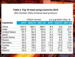 В World Steel Association (worldsteel) пересмотрели прогноз по стальному спросу на 2020 год. Согласно ожиданиям ассоциации, потребление стали по итогам года достигнет уровня в 1,725 млрд. тонн, что на 2,4% ниже объёмов 2019 года (июньский прогноз WSA предполагал уменьшение объёмов на 6,4%). Доля КНР в общемировом стальном потреблении в 2020 году составит 57% с улучшением показателей на 8%. В странах с развитой экономикой потребление металлопроката сократится на 14,9%, с развивающейся - на 12,3%.