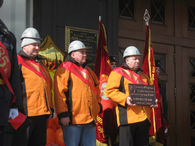 Знамённая группа вносит священные реликвии: знамя коллектива комбината, памятные знамёна государственного комитета обороны, врученные на вечное хранение коллективам цехов – доменного, мартеновского № 1, среднесортного, Теплоэлектроцентрали.