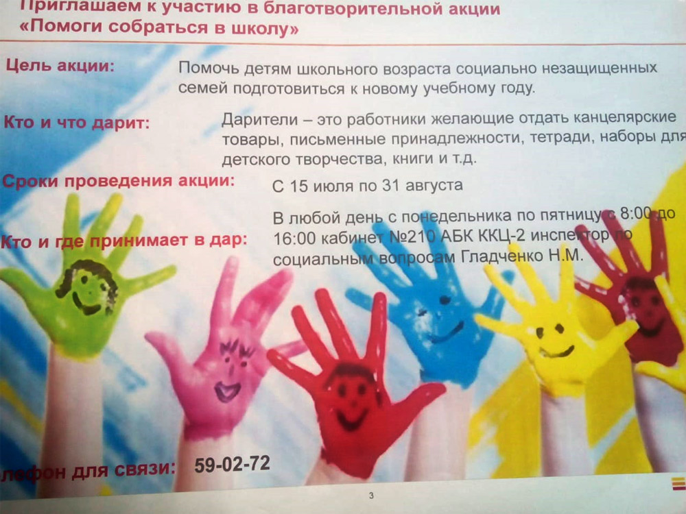 В цехе сформировалась команда энтузиастов, которые постоянно помогают в шефской работе. Это Светлана Потапенко, Ольга Белянцева, Татьяна Омельчук. В августе мы объявили об акции «Помоги собраться в школу», и наши работники с большим воодушевлением приняли в ней участие. На собственные средства приобретали канцелярские товары, предметы, необходимые в учёбе и сдавали нам. Координировала эту работу инспектор по социальным вопросам Наталья Гладченко, за что ей большое спасибо. Благодаря акции мы смогли помочь более чем двадцати нашим работницам – матерям-одиночкам, либо тем семьям, которые относятся к категории особо нуждающихся.