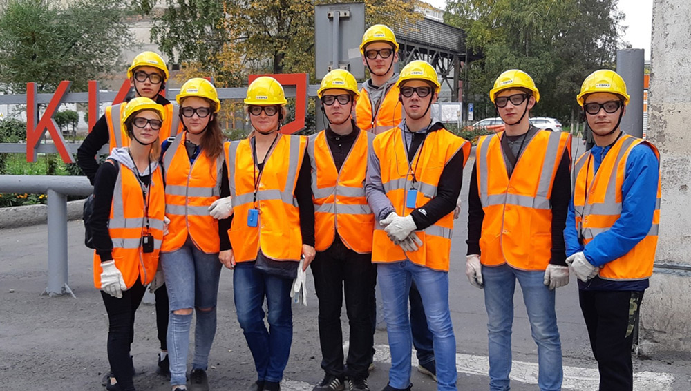Традиционно перед посещением цеха студенты прошли инструктаж по технике безопасности и получили средства индивидуальной защиты (каски, очки, перчатки, жилеты).