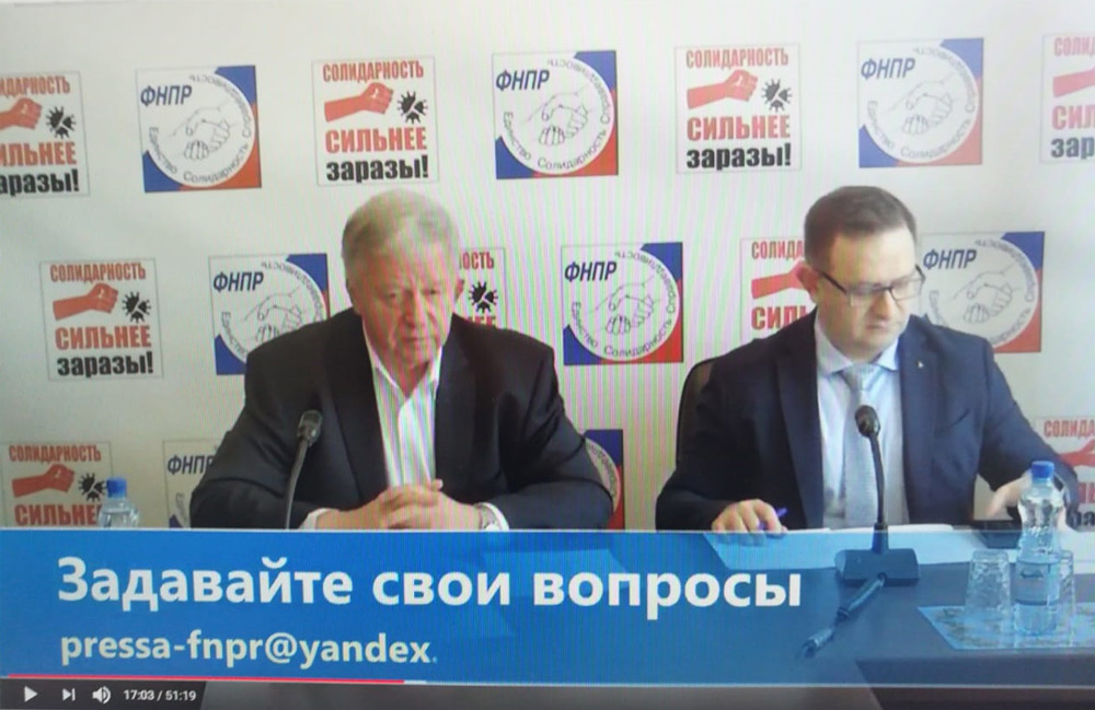 В ходе пресс-конференции М. Шмаков ответил на ряд вопросов, поступивших от профсоюзных лидеров, представителей профсоюзных СМИ, членов профсоюза. В частности, о том, в каком формате в этом году будет проводиться Первомай в связи с ограничениями массовых мероприятий, какова экономическая ситуация в стране в связи с эпидемией коронавируса, есть ли случаи нарушения прав работников, как работают профсоюзные организации в этих условиях и многие другие.