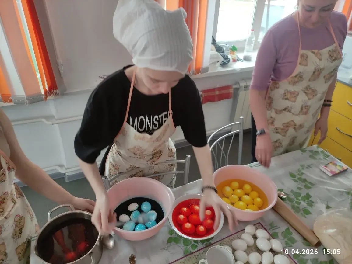 В его преддверии шефы первичной профорганизации, работники ЦВСиВО, Дирекции по энергетике и Кислородного производства, устроили мастер-класс для своих подопечных. Они учили их, как правильно готовить традиционное угощение – пасхальную выпечку, красить яйца и другим кулинарным секретам.